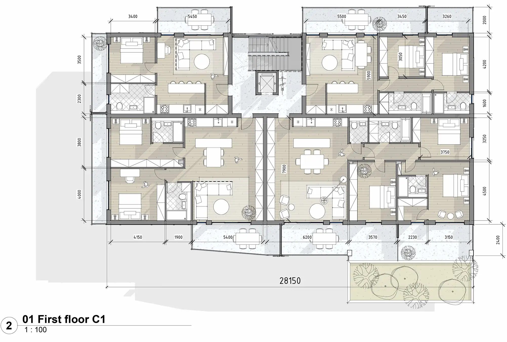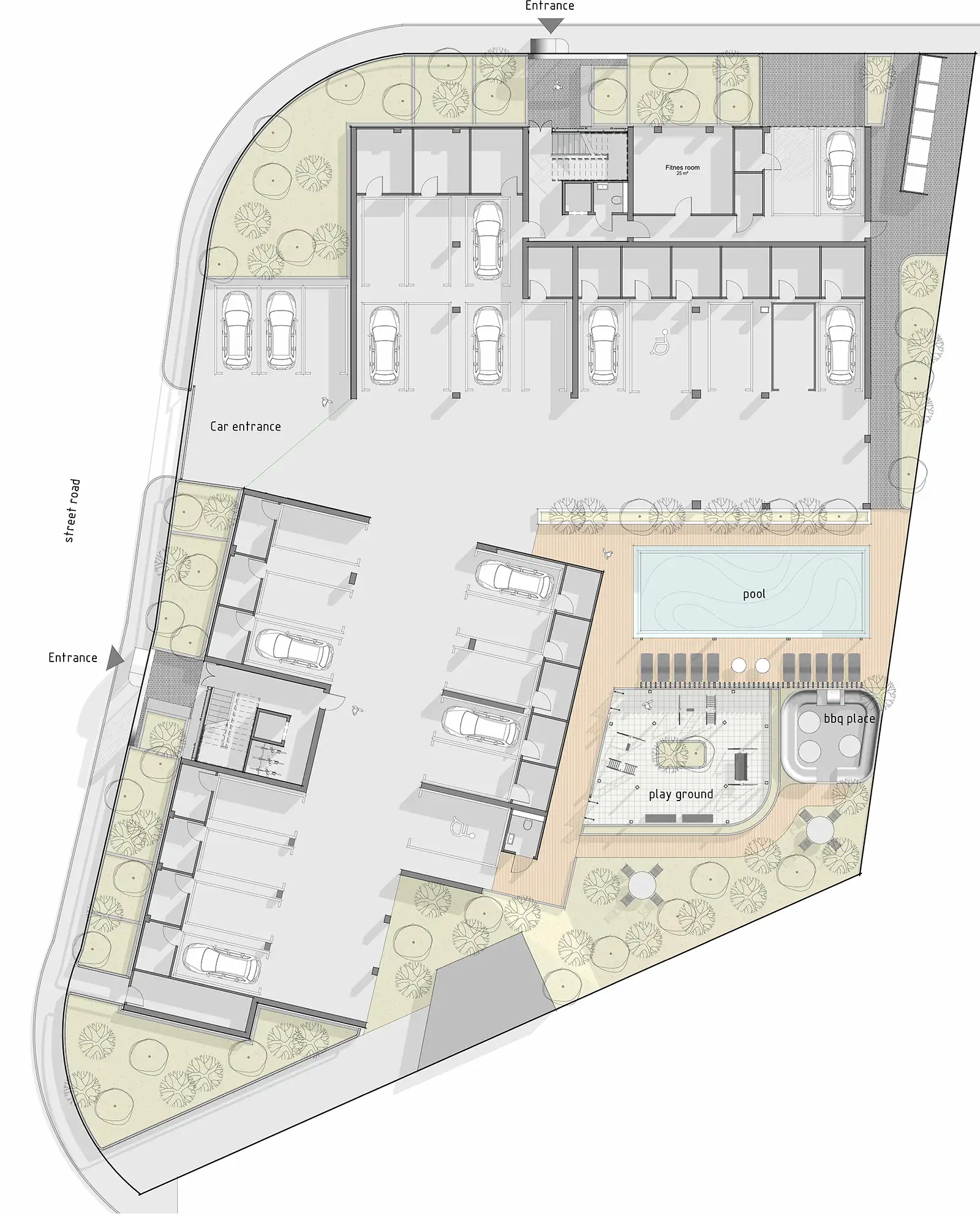 Landscaped central area with private pool, kids’ area, and gym
